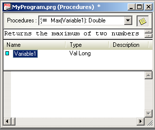 In the example below, selecting Object After from the Insert menu inserts a Variable1 with a default Type of Long and Val Parameter in the Variables View of the Procedures View: