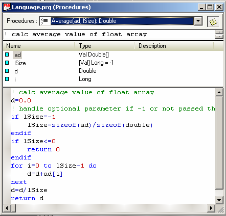 The following example shows a function procedure, called Average, in the Procedures View.