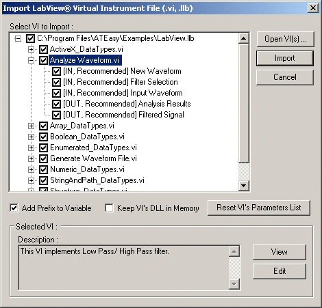 First, to use a VI or a LLB of VIs, you first use the Import LabVIEW Virtual Instrument File… command. This command is available from the ATEasy Insert menu when the module Procedures is selected. Once the Import LabVIEW Virtual Instrument dialog is opened and you have selected the VI, LLB or LVLIBP file, a list of VI is displayed. Each VI is displayed with its connectors bellow. ATEasy display a check box next to each VI and its connectors. Select the VI and it's connectors that you want to use and click on Import. This generates ATEasy procedures for each one of the VIs you have selected. A parameter is also created fro each connector. These procedures can be called like any other ATEasy procedures once they have been imported and created.