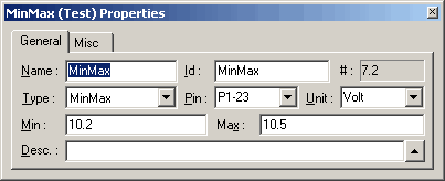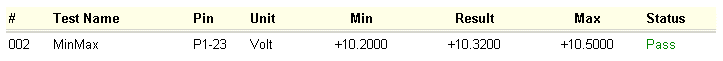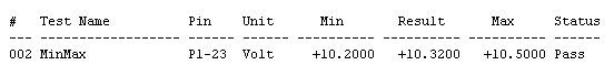 In the example shown above, a Min/Max test is used to measure DC voltage. The Min/Max test properties include the minimum and maximum allowable values (high and low limits), the actual pin where the measurement is being taken, and the units (VDC, VAC, Hz, etc.). During testing, these parameters are printed into the test log.
