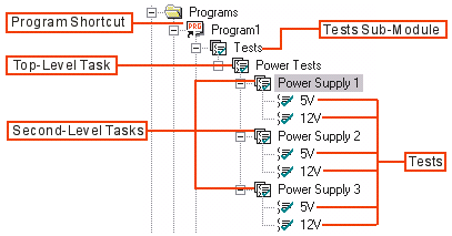 The program shortcut, Program1, contains the Tests sub module. Directly under the Tests sub module is the top-level task, Power Tests, and under Power Tests are three sub-tasks: Power Supply 1, Power Supply 2, and Power Supply 3.
