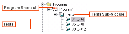 The program shortcut, Program1, contains the Tests sub module. This program contains only three tests, so there is no need for a task level. The three tests are directly below the Tests sub module.
