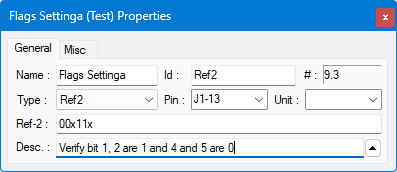 The Ref2 properties include a single Reference/Mask string. During testing, the reference parameter is printed on the test log. The reference is the expected value and the mask represents the bits that should be compared. A mask of “101” specifies that bits 0 and 2 should be compared. Both values are 32 bits integer (long).