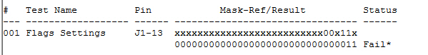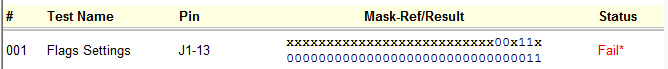 When a REF-2 reference test is completed, the internal variable TestRefResult variable or TestResult Variable is compared against the reference/mask, ignoring the bits specified as "don't care" (x). This variable should be set during the test execution by a program statement. If the result and the reference/mask are identical, the TestStatus is Pass (1). If it is not, the TestStatus is Fail (2).