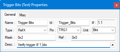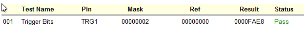 The RefX test is typically used with hexadecimal tests where data has to be compared against a known reference using a mask. This test compares the 32-bit (DWord) test result (the internal variable, TestResult) with a hexadecimal reference mask, ignoring the bits specified as zero (0) by the mask. Both reference and mask should be specified for this test. If no mask is specified, the mask is set to 0. All bits are “don’t care”.