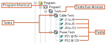 In Program 1, the Cable Tests task runs first and the Power Tests task runs second. Within Cable Tests, the J1 to J4 test runs first, the J5 to J8 test runs second, and the J9 to J12 test runs third. After all the tests in the Cable Tests task have executed, Power Tests runs. After the tasks in Program1 have executed, Program2 runs.