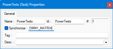 Used for multi-threading or Multiple UUTs with parallel run mode applications. When Synchronize is checked, it allows only one thread to execute the task with the specified (optional) Synchronize Resource Name, other threads executing tasks, tests or procedures with the same name will be suspended until the task is complete. The synchronize flag is used to protect shared resources such as instruments, shared variables from being accessed more than once at the same time. Internally, ATEasy run-time creates an AMutex object for synchronization. The Synchronize Name text box is only displayed if Synchronize is checked. Any series of characters/string can be used for the name.