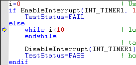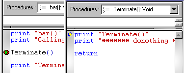 If the procedure where execution has been paused has been called by another procedure, ATEasy places a green triangle at the entry point of the calling routine.