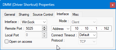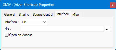● File specifies the file that will be read from or written to. If this file name is empty, then the driver File Interface file name (in Driver Interfaces Properties Window) will be used (default file name). If the driver property and the driver shortcut property specify different file path names, this shortcut file path name will always be used.