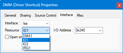 ● Resource: Select the resource for the interface. The labelling of the Resource options with numbers at the end, such as DMA 1 to DMA 2, IO1 to IO8, IRQ1 to IRQ2, and MEM1 to MEM2 indicate "presets," and not the addresses themselves. The specific DMA settings, IO ports, interrupts, and memory addresses are set using the properties for each option.