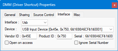 ● Ignore Serial Number - when checked, the Serial value will be ignored and the run time will attempt to associate a device with the exact vendor id/product id to this driver shortcut. If the serial is not checked (default), a run time error will be issued when the device with the exact serial number does not exist. This setting allows the run-time to use an instrument with same type but with different serial number.