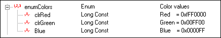The enumColors data type contains three definitions: Red, Green, and Blue, which are each assigned a hexadecimal value. ATEasy substitutes the values when you use the enumerated type in your code. For example if you use the Red definition, ATEasy substitutes the value 0xFF0000.