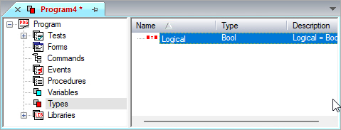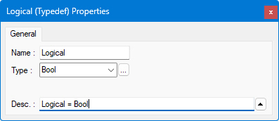 The example below illustrates a Properties window for a Typedef named Logical with a data type of Bool. The user created a Typedef of Logical for a Boolean data type because the name Logical was more descriptive than Bool. The description in the Desc field explains that Logical is the typedef name or alias for Bool.