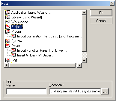 Click the Project icon, then click OK. The new project is displayed in the ATEasy workspace.