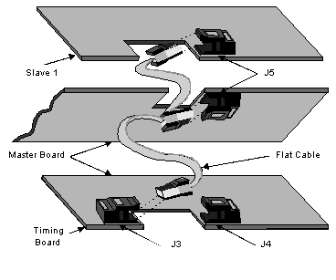 The Timing Module installed on the standard I/O board makes this board a Master. The other standard boards are Slave boards, which are piggybacked to the Master board with a supplied clock distribution ribbon cable connected from J3 on a Master board to J5 on each of the other Slave boards. See Setup and Installation for more details about board installation.