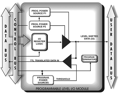 Level shifting is achieved using special driver/receiver pairs and on-board programmable variable power supplies to translate logic levels. Interfaces to TTL, CMOS as well as custom levels can be translated within the module operating voltage range (see Specification table).