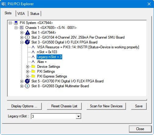 Legacy nSlot is used by earlier versions of HW/VISA. The slot number contains no chassis number and can be changed using the PXI/PCI Explorer applet: 23 in this example.