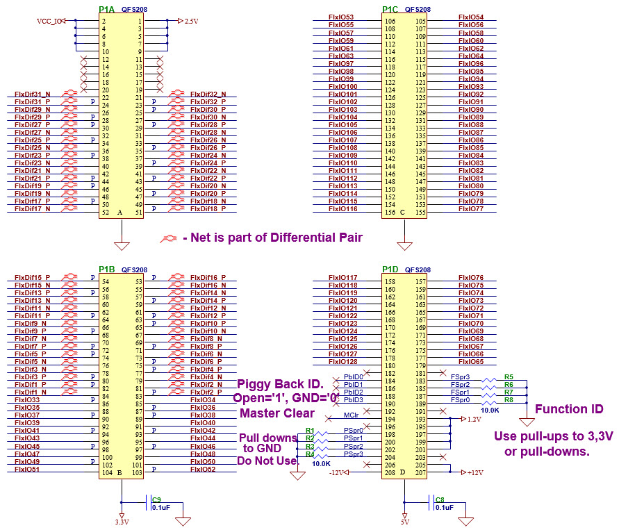 P1 is a High-Speed Terminal Strip with Rugged Ground Plan manufactured by Samtec (http://www.samtec.com/). It has a middle bar that is used for ground and power connections. The part number for P1 is QFS-104-06.25-SL-D-A. The figure below shows a schematic diagram of P1.