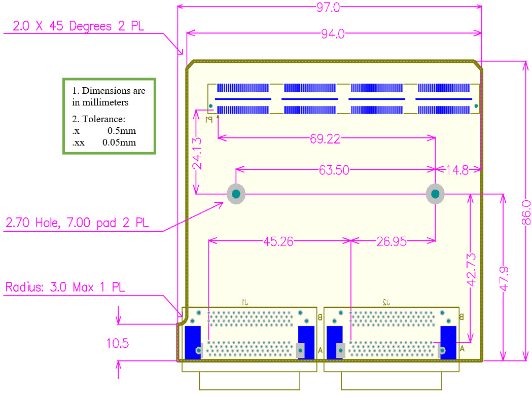 The locations of the mounting holes and connectors are critical to ensure a proper fit between the GX3700 and the expansion board. The figure below describes the mechanical details of a typical board and the locations of connectors and mounting holes. The figure presents a transparent view of the board from the top, with dimensions for critical component locations. The coordinates for the connectors are pointing to the component reference point. For P1 it is the middle between pads 1 and 2 of the footprint, as shown in the figure Component P1 Reference Point. For J1 and J2 it is the center of pad A1 of the footprint, as shown in the figure Components J1, J2 Reference Point.
