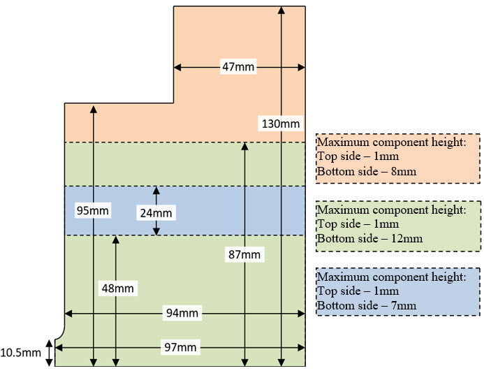 The figure below describes the recommended maximum dimensions for the expansion board and the recommended maximum component height. The maximum board area is about 110 Sq centimeters or about 17 sq inches.
