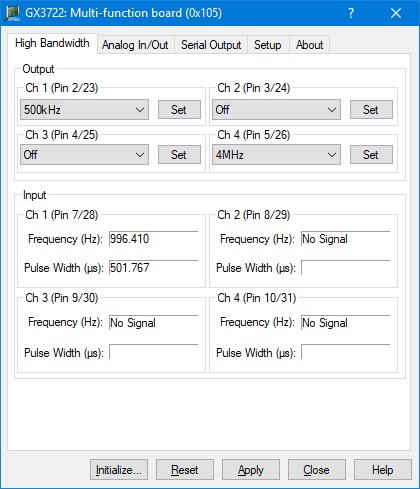 Frequency list: Sets/displays the programmable High Bandwidth Output channel’s frequency. Selections are: Off, 125kHz, 250kHz, 500kHz, 1MHz, 2MHz, 4MHz, 8MHz.