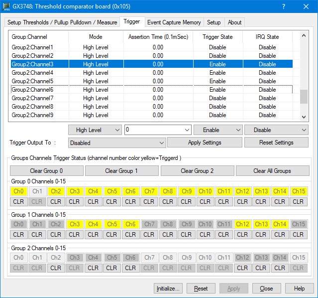 Group 2 Channels 0-15: sets/display the trigger settings of each channel in the group. If channel trigger and/or IRQ are enabled than the channel is enabled. If the channel number background is yellow, that means that a trigger occurred on that channel. The user can then click the CLR button to clear the trigger.
