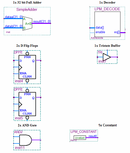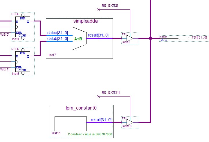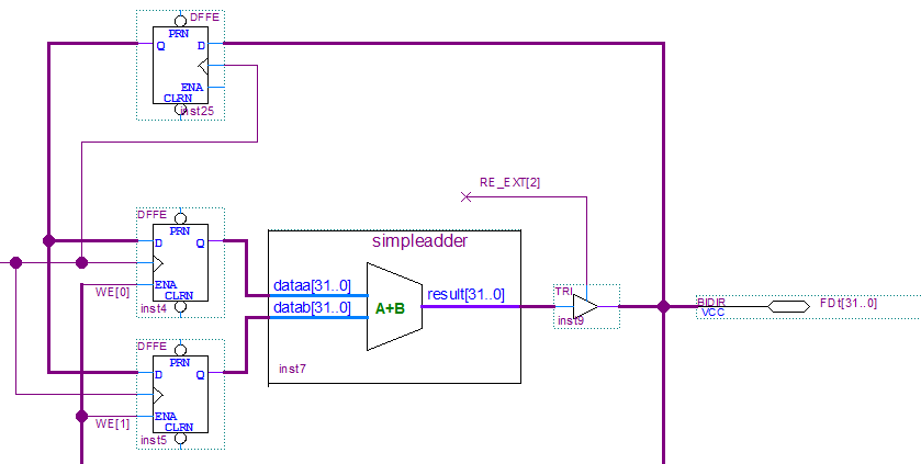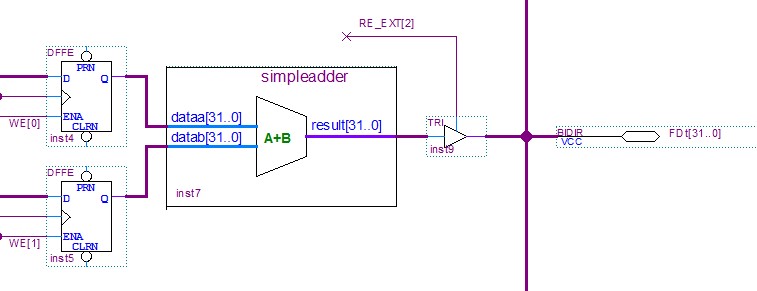 Finally, you can change the inputs to the adder from write-only to read/write by connecting the output of the D-Flipflops to the FDt inout pin via a tristate buffer. After adding this buffer, the complete adder circuit should appear as below: