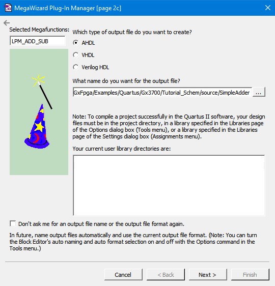 Name the output file SimpleAdder and make sure the path is the same as your project. Click Next and enter 32 as the data width.