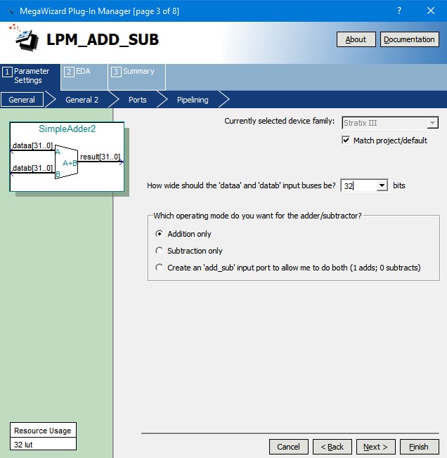 The 32-bit adder will be placed onto the design using the MegaFunction wizard tool. This tool will customize a component by allowing you to make selections through a wizard.