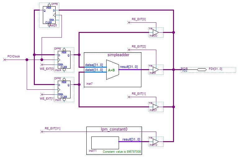 The D Flips Flops will feed a 32-bit adder and the resulting summation will be wired to the PCI data lines so that the PC can read the result.