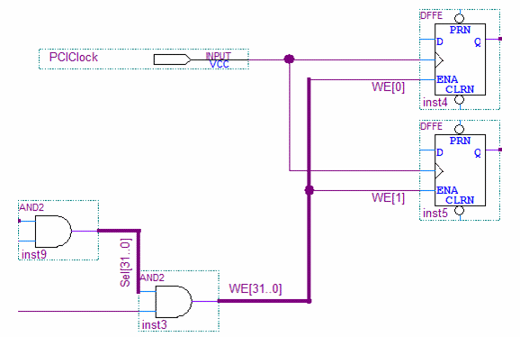 Place two D Flips Flops (located at primitives, storage, dffe) and an input pin named PCIClock. We will leave the D Flip Flops input lines (D) disconnected for now. Eventually the PCI data lines will drive these inputs.