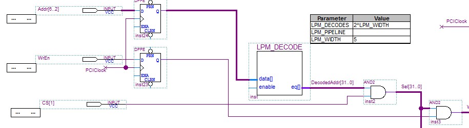Now that the PCI address decoder circuit is complete, we can feed the appropriate bits from the WE bus to D Flip Flops that will store data clocked in from the PCI data lines. For example, the first double word in PCI memory (representing the first number to be summed) will be written to a D Flip Flop with it enables line tied to WE[0] (the first bit in the WE bus). The second double word to be added will be written to another D Flip Flop with it enables line tied to WE[1]. Finally, the PCI Clock signal (33Mhz) will be used as the clock source of the D Flip Flops. Note that each bit of the Sel and WE busses represent a consecutive double word address (bit 0 corresponds with byte 0, bit 1 corresponds with byte 4, bit 2 corresponds with byte 8 etc.)