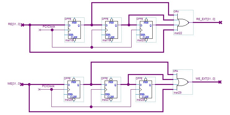 Since this design is created to be able to be implemented in both the 3700 and the 3700e, we need to extend our read enable pins, RE[31..0], for 3 more clock cycles. Below is the circuit to do that.