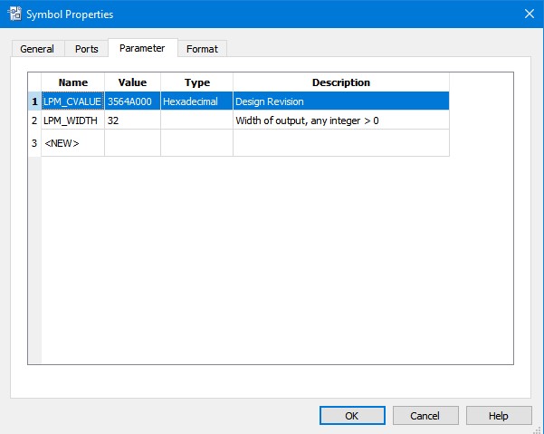 A constant component needs to be placed in the design (LPM_CONSTANT). When placing this component make sure that the “Launch MegaWizard Plug-In” selection is unchecked. After placing the component, right click on it and select properties to set the value and width of the constant as the following figures show: