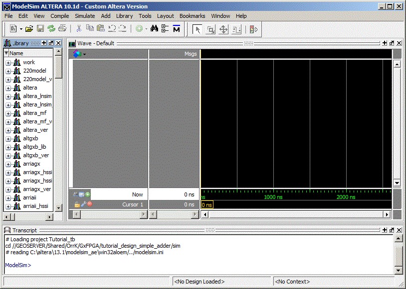 2. Click Fileà Change Directory and choose the sim folder under the Tutorial folder. At this point the ModelSim should display the simulation pins:
