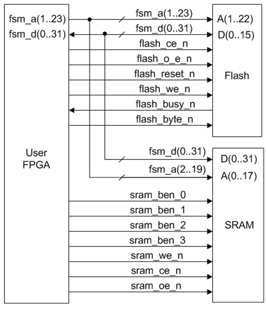 Inter-FPGA Bus Interface Diagram figure is a more detailed block diagram of the connections between the User’s FPGA, the Flash and the SRAM: