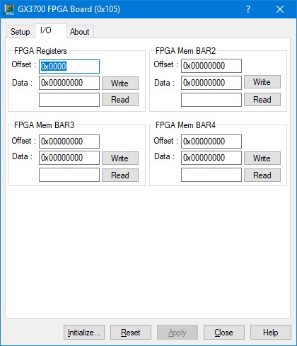 Offset Text Field: The offset into the FPGA Register or Memory space (BAR2-4) in bytes. This field can be used with a decimal or hexadecimal value (prefix the value with 0x). The offset is limited to 0x400 bytes when reading the register space and 0x40000 bytes when reading the memory space. Offset must be specified on a 4 byte alignment.