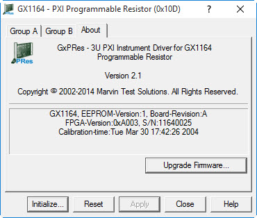 The top part of the About page displays version and copyright of the GXPRES driver. The bottom part displays the board summary, including the EEPROM version, the board Revision, the FPGA version, the board serial number and the calibration time. The About page also contains a button Upgrade Firmware… used to upgrade the board FPGA. This button maybe used only when the board requires upgrade as directed by Marvin Test Solutions support. The upgrade requires a firmware file (.jam) that is written to the board FPGA. After the upgrade is complete you must shut down the computer to recycle power to the board.