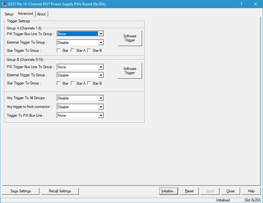 PXI Trigger Bus Line To Group Dropdown List : Sets and displays the specified PXI trigger bus connected to Group A (Channels 1-8) settings. Selection is one of: None, PXI Trigger Bus Line 0, PXI Trigger Bus Line 1, PXI Trigger Bus Line 2, PXI Trigger Bus Line 3, PXI Trigger Bus Line 4, PXI Trigger Bus Line 5, PXI Trigger Bus Line 6, PXI Trigger Bus Line 7,
