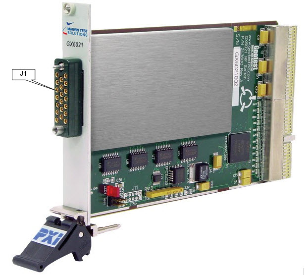 The GX6021 is a 300 MHz bandwidth, 3U high-density PXI switching card. The GX6021 has four groups of 1x4 Multiplexers configured by software to provide switch paths. Each switching group of the GX6021 has five channels. There are five relays to connect any one of the channels to the bus. In addition, there is a sixth relay to connect the group’s bus to the bus of the adjacent group.