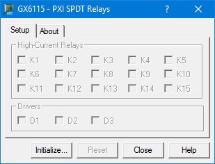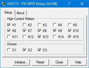 High Current Relays Group Box (Relays K1 – K15): Displays the current relay setting (closed or open). When a box is checked, the relay is closed. Similarly, unchecked boxes mean relays are open.