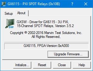 The top part of the About page displays version and copyright of the GX6115 driver. The bottom part displays the board summary, including the EEPROM version, the board Revision, the FPGA version. The About page also contains a button Upgrade Firmware… used to upgrade the board FPGA. This button maybe used only when the board requires upgrade as directed by Marvin Test Solutions support. The upgrade requires a firmware file (.jam) that is written to the board FPGA. After the upgrade is complete you must shut down the computer to recycle power to the board.
