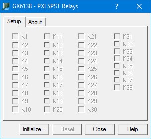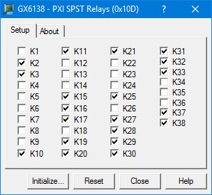 Matrix Display Area (Relays K1 – K38): Displays the current relay setting (closed or open). When a box is checked, the relay is closed. Similarly, unchecked boxes mean relays are open.