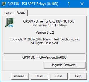 The top part of the About page displays version and copyright of the GX6138 driver. The bottom part displays the board summary, including the EEPROM version, the board Revision, the FPGA version. The About page also contains a button Upgrade Firmware… used to upgrade the board FPGA. This button maybe used only when the board requires upgrade as directed by Marvin Test Solutions support. The upgrade requires a firmware file (.jam) that is written to the board FPGA. After the upgrade is complete you must shut down the computer to recycle power to the board.