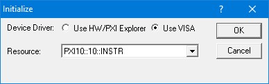 2. Use VISA – this is a third party device driver usually provided by National Instrument (NI-VISA). When selected, the Resource list displays the available boards installed in the system and their VISA resource address. The chassis, slots, devices and their resources are also displayed by the VISA resource manager, Measurement & Automation (NI-MAX) and in Marvin Test Solutions PXI/PCI Explorer. The following figure shows PXI10::10::INSTR as the VISA resource (PCI bus 10 and Device 10). This is VISA resource string argument (szVisaResource) passed by the panel when calling the driver Gx6138InitializeVisa function to initialize the driver with the specified board.