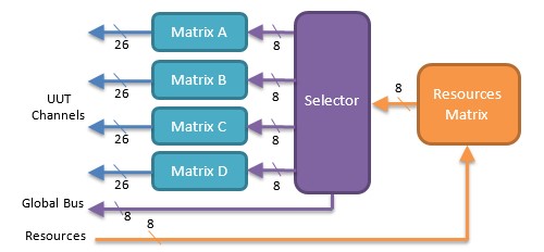 As shown in the figure below, the UUT 104 x 8 switch matrix is implemented as four 26x8 matrices to reduce stub length and the selector helps with facilitating this architecture. Each section of the block diagram is shown in a different color and is described below.