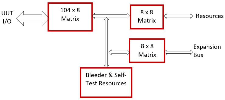 The GX6188 architecture can represented by of (2) 8x8 matrices and a 104 x 8 matrix. As shown in the figure below, the expansion bus allows users to create multiple high-density configurations such as 208x8x16, 312x8x24, 416x8x32, etc., without sacrificing the switching subsystem’s total I/O configuration for multiple module configurations. In addition, the module includes a resistor bleeder network as well as a self-test resource to facilitate built in test capability. The switching module also includes on-board circuitry for counting and recording the total number of relay closures, providing prognostic data for predicting relay life.