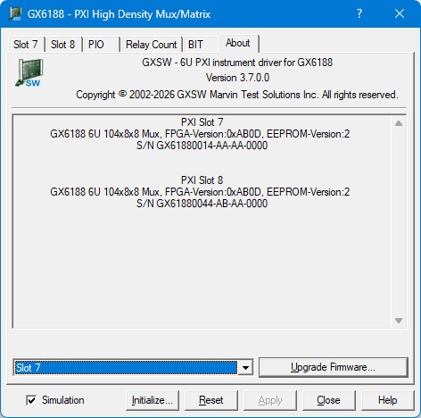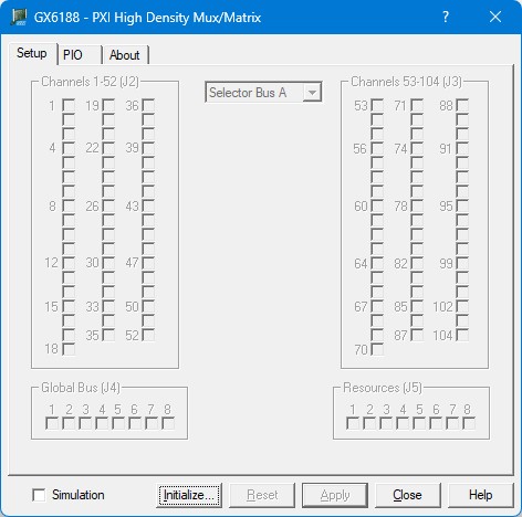 Initialize – Scans the current system for any GX6188 instruments and initializes each one. The current settings of each device will not change after calling initialize. The panel will reflect the current settings of each device.