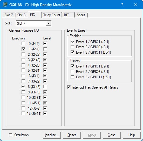 Tripped (checkboxes): Displays the status of the specified event line. If the box was checked, it indicates that the event line has gone low. The board must be Reset to clear the Tripped status.