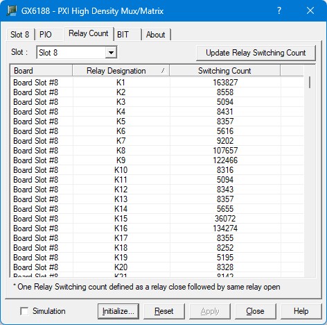 Update Relay Switching Count (button): This button retrieves the latest Relay Switching Count data from the board and automatically update the Relay Count List. Once updated, the list is sorted by Relay Designation number in ascending order (lowest to highest).